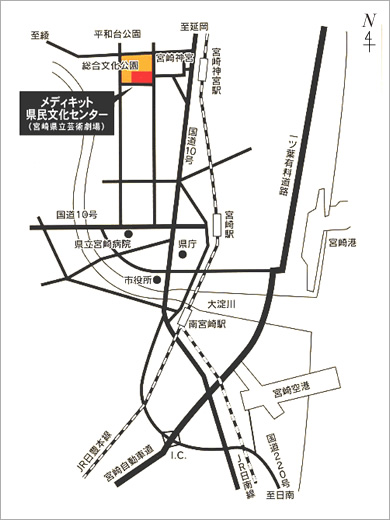 - ・東九州自動車道「宮崎西IC」から国道10号線を「宮崎市内」方面へ車で約15分