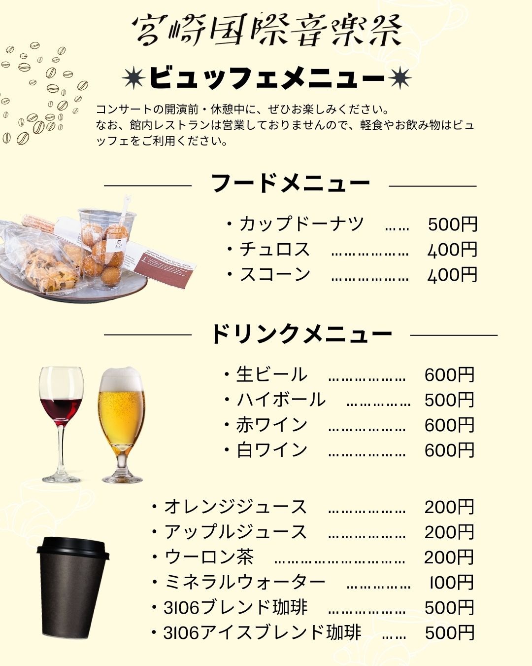 なお、館内レストランは営業しておりませんので、軽食やお飲み物はビュッフェをご利用ください。