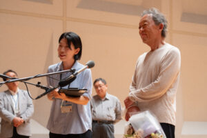 このたび、宮崎国際音楽祭に出演のチョン・ミョンフン氏がミラノ・スカラ座の次期音楽監督に就任することが発表され、オーケストラ・リハーサルの合間に三浦文彰音楽監督から花束を贈呈しました。