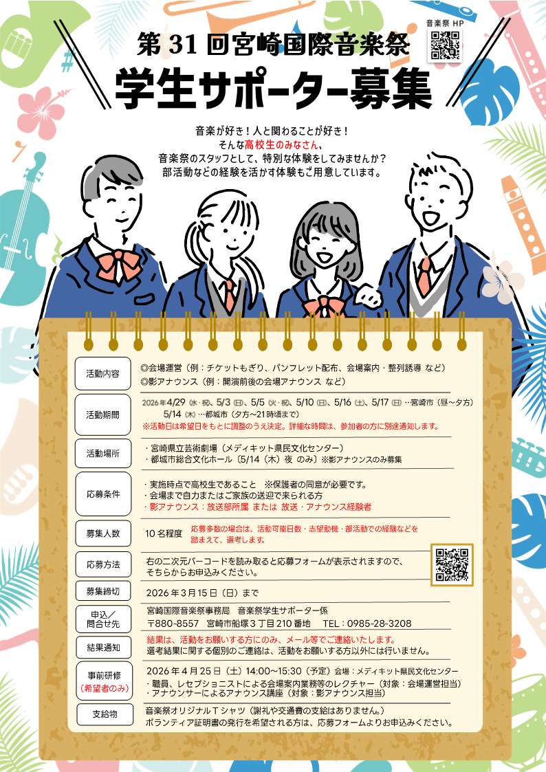 宮崎国際音楽祭では、高校生のサポーターを募集します!